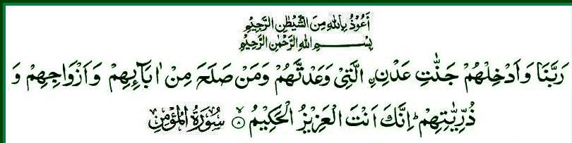 Ayat 8. (Angels who bear the Throne of Allah and those around it saying): "Our Lord! And make them (who repent and follow Your Way) enter the 'Adn (Eden) Paradise (everlasting Gardens) which you have promised them, and to the righteous among their fathers, their wives, and their offspring! Verily, You are the All-Mighty, the All-Wise.